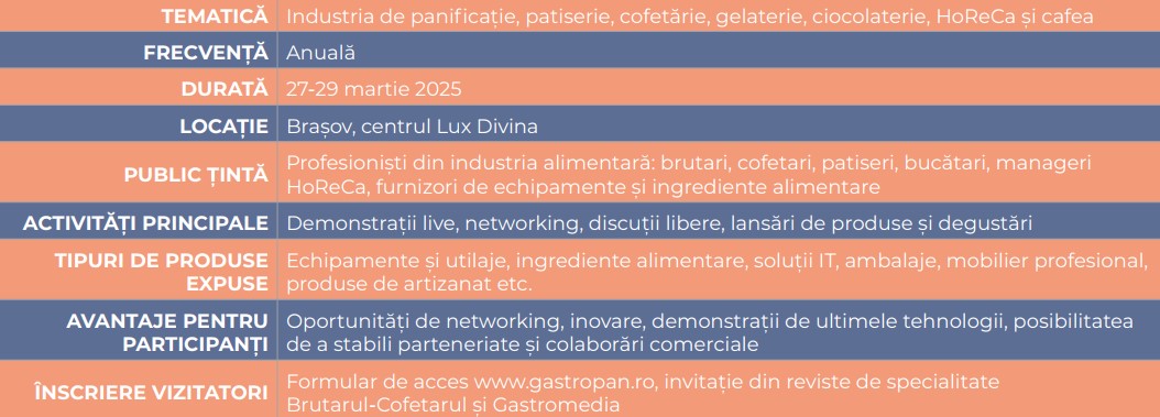 Evenimentul din 27-29 martie 2025, organizat la complexul Lux Divina din Brașov, va aduce în prim-plan tehnologii de ultimă generație și tendințe actuale. Vizitatorii vor putea participa la discuții libere, degustări și demonstrații live, iar expoziția atrage deja expozanți și mii de vizitatori internaționali. Un punct forte al GastroPan este programul său diversificat, care facilitează discuții tehnice, schimb de idei și formarea de noi relații de afaceri. Evenimentul promovează inovațiile din industrie, prezintă concepte noi și oferă demonstrații de rețete delicioase.